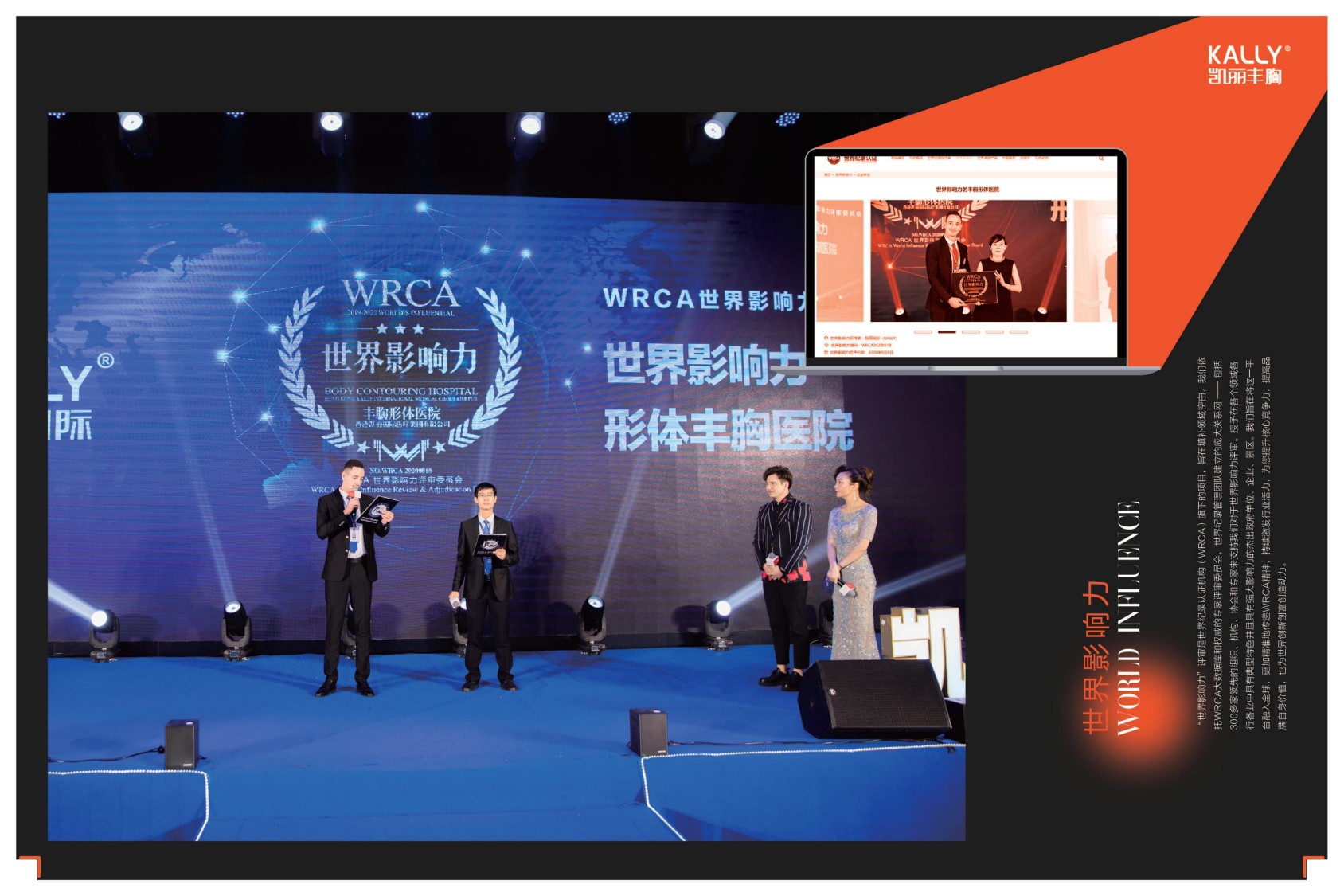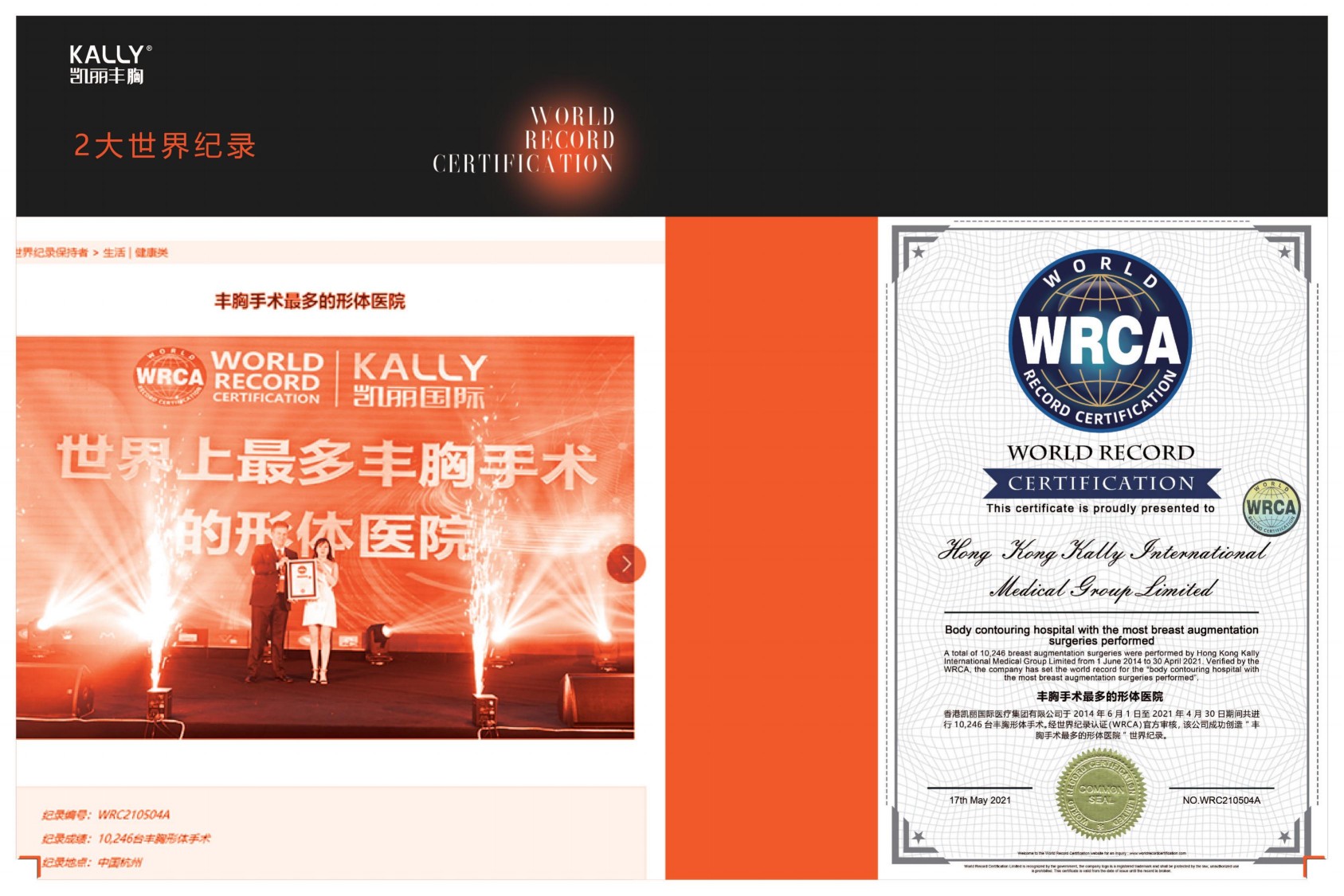 凯丽丰胸被WRCA世界影响力评选委员会评为世界影响力丰胸形体医院,并获得了2个世界记录:世界上最多丰胸手术的形体医院和世界上最多丰胸手术直播的形体医院。