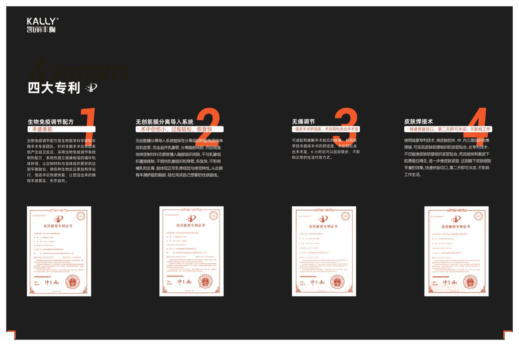 凯丽丰胸19年专注形体一件事,深研每一个细节,用专注、专业打造极致曼妙身姿。且有四大专利为其保驾护航,让客户们在享受服务的同时,能够感受到来自凯丽集团的贴心关怀和专业保障。这四大专利技术不仅提升了丰胸手术的安全性和效果,也大大减少了术后并发症的风险,让客户能够更加放心地追求美丽。