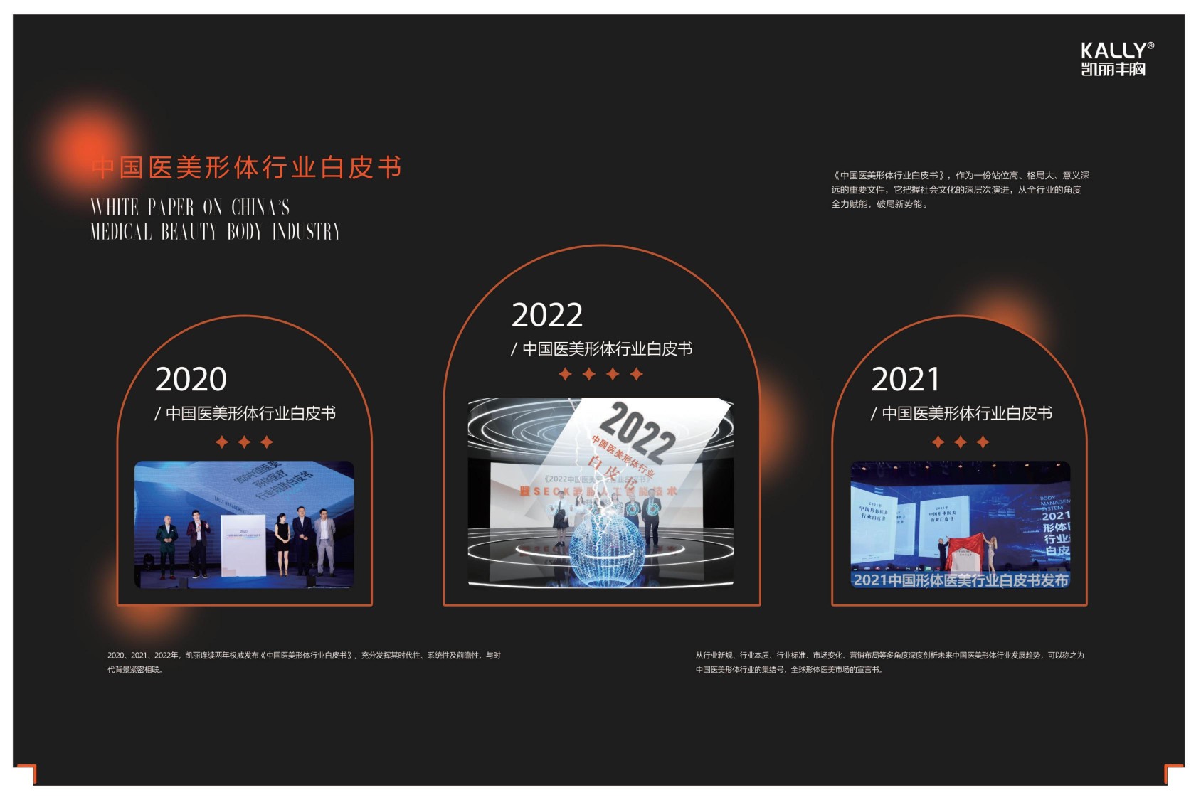 凯丽集团从2020年至2024年,连续五年权威发布《中国医美形体行业白皮书》,充分发挥其时代性、系统性及前瞻性,与时代背景紧密相连。从行业新规、行业本质、行业标准、市场变化、营销布局等多角度深度剖析未来中国医美形体行业发展趋势,可以称之为中国医美形体行业的集结号,全球形体医美市场的宣言书。